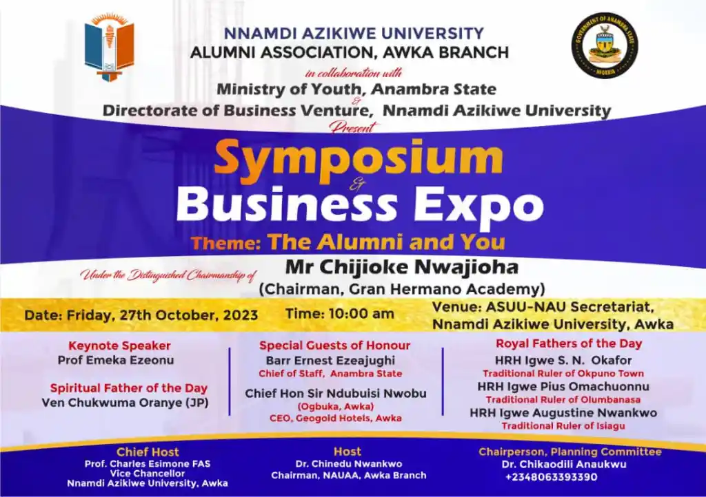 The Awka branch of the Nnamdi Azikiwe University Alumni Association, in collaboration with the Anambra State Ministry of Youth, recently organized a one-day symposium and Business Expo, focusing on the theme “Alumni and You.”.
